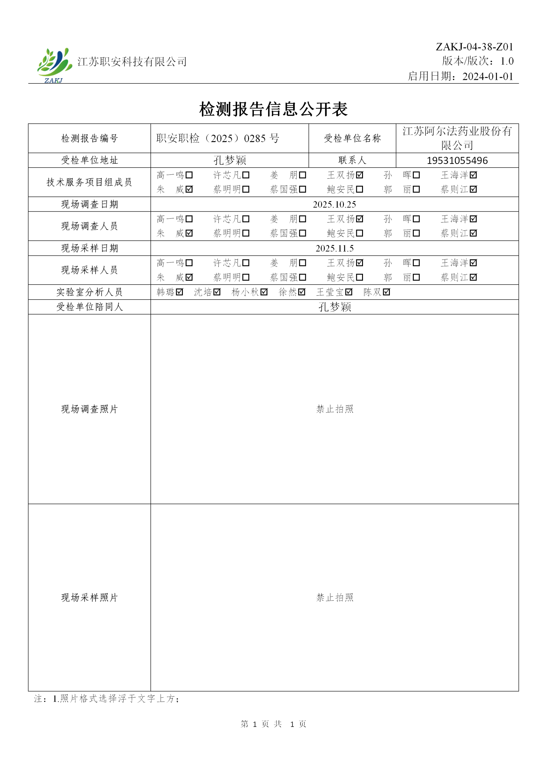 檢測(cè)報(bào)告編號(hào) 職安職檢(2025)0285號(hào)